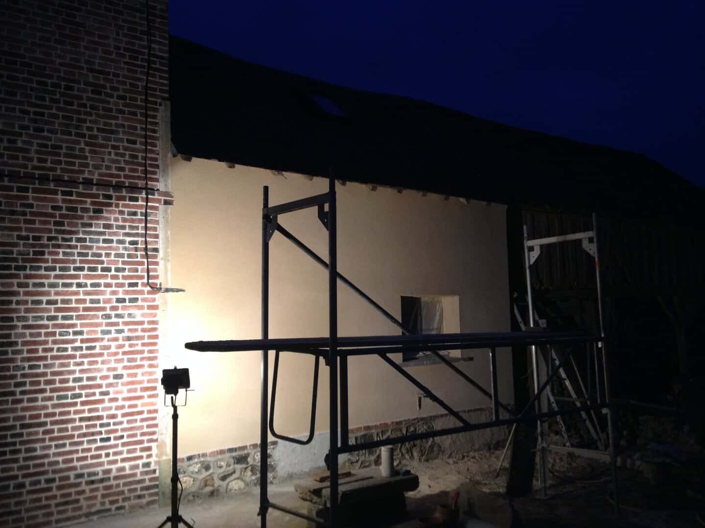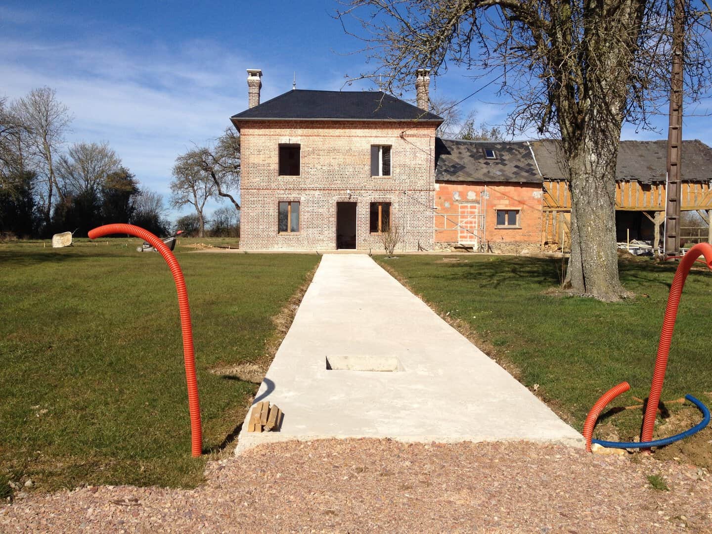 Joints de façade terminés. Création de l’allée en béton armé avec passage de fourreaux électriques en attente